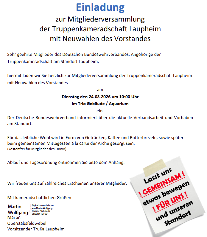 Truppenkameradschaft Laupheim 24.03.2026 10:00 Uhr Mitgliederversammlung mit Wahlen